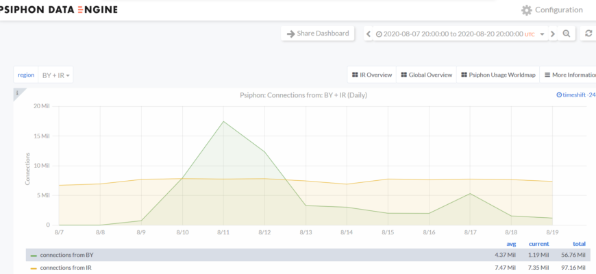 Psiphon стал широко известен белорусам в августе 2020 года. Благодаря этому приложению можно обойти блокировку интернета. Популярен он в стране и сегодня, но теперь пики использования приходятся на воскресенья. Например, только 6 декабря, когда прошёл последний на данный момент протестный марш, белорусские пользователи подключались к Psiphon 1,234 млн раз.
