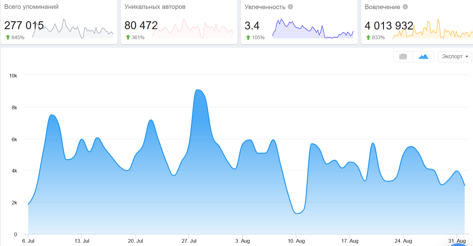 9-11 августа на графике наблюдается провал упоминаний («яма»), что безусловно связано с нарушением, в частности связаности (маршрутизацией) и блокировкой социальных медиа в компьютерной сети Интернет.