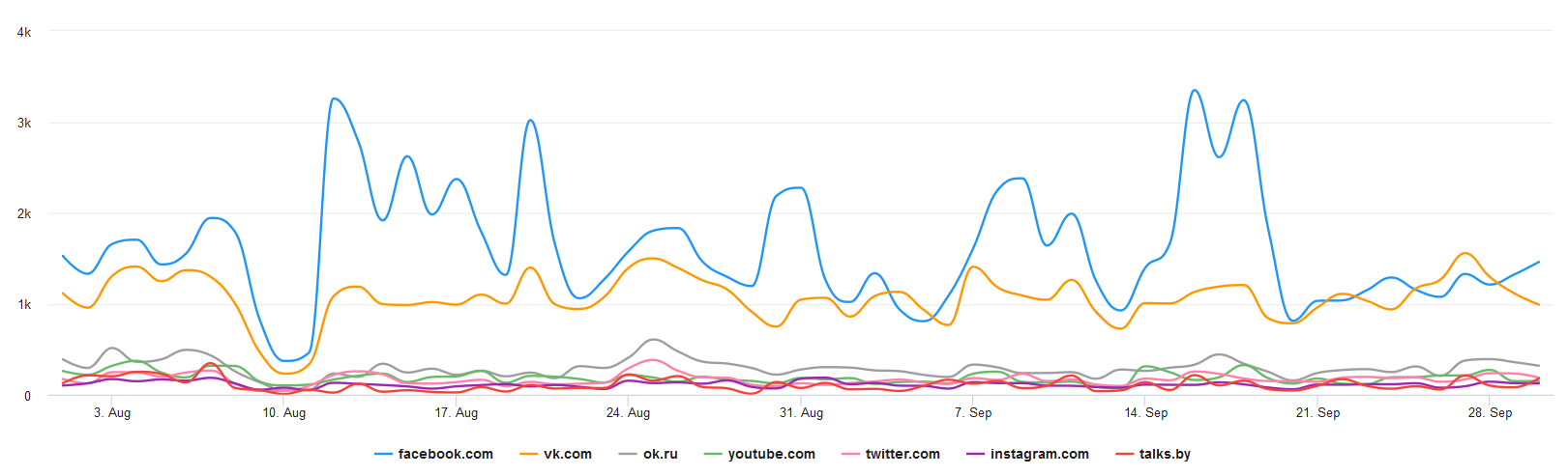 Характерен провал 9-11 августа, когда связность беларуского интернета была нарушена и мобильная аудитория уменьшилась более чем на 80%.