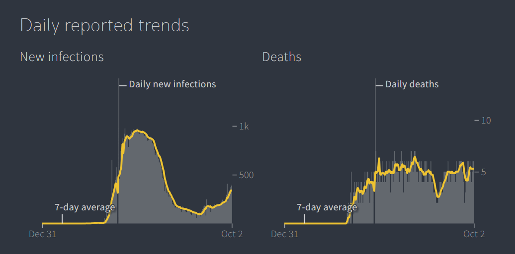 На этом графике, взятом из данного источника, следует обратить внимание на точку 7 сентября 2020, когда число заболевших начало превышать число выздоровевших: