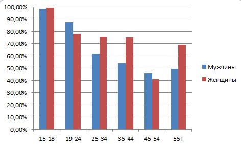 Как видно, что возрастной группе 15-18 лет эти сети охватывают практически 100% интернет-аудитории. Естественно, с увеличением возраста охват соцсетями белорусской интернет-аудитории уменьшается. Также уменьшается и affinity (индекс соответствия).