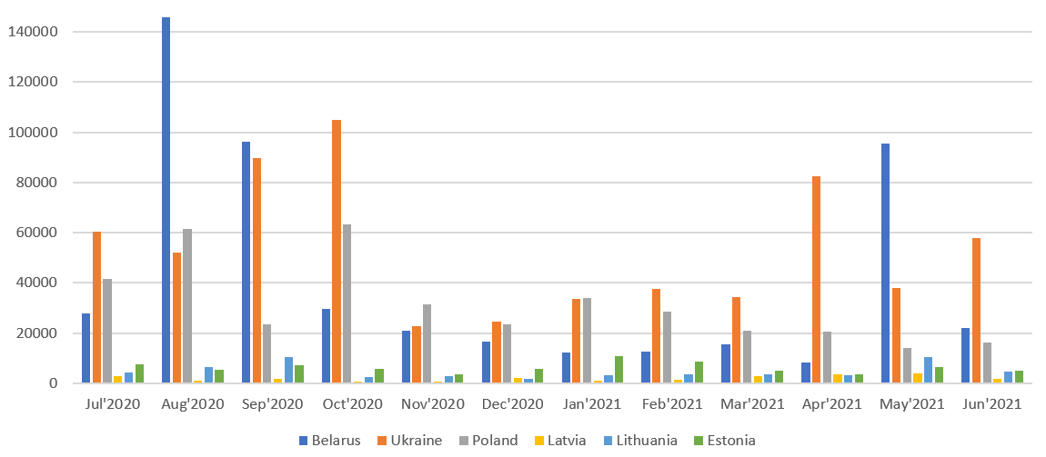 Ежемесячное распределение авторов твитов ссылающихся на публикации, в которых упоминаются исследуемые страны, за период с 1 июля 2020 по 30 июня 2021: