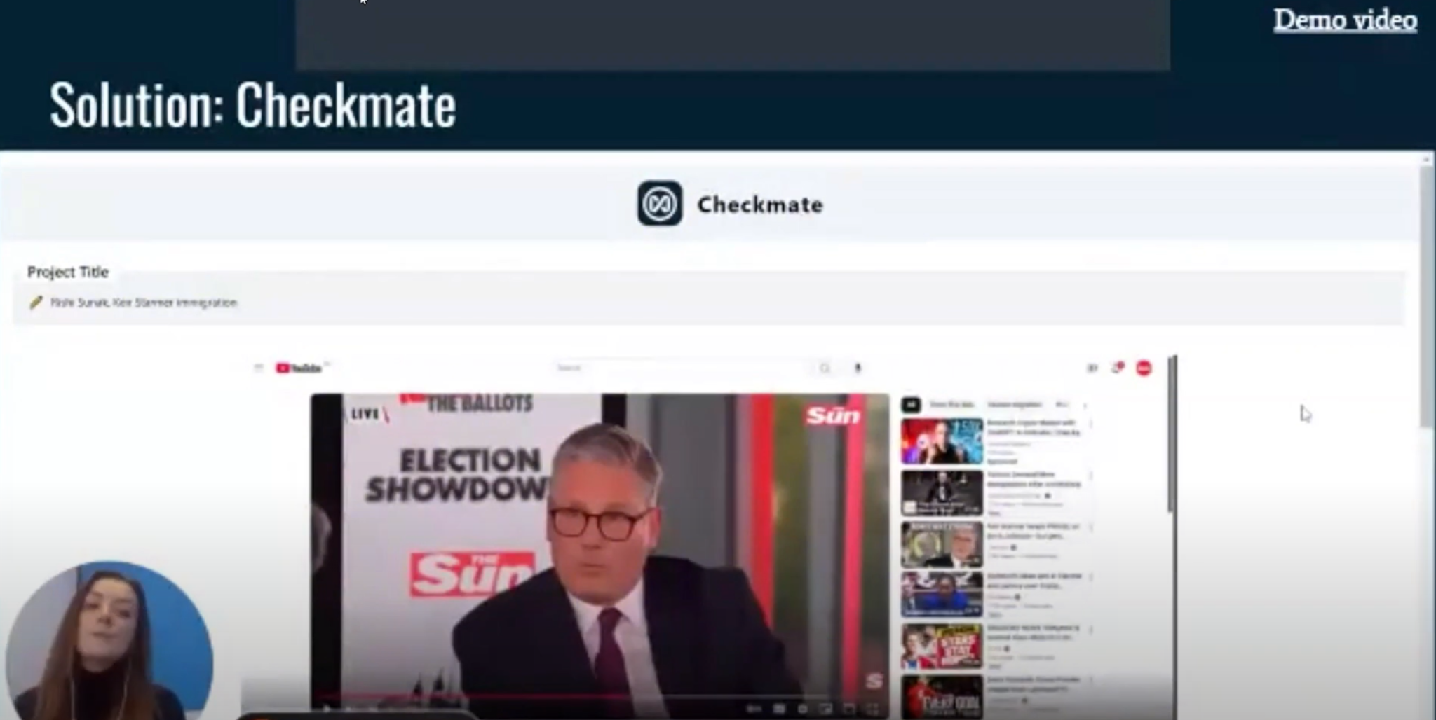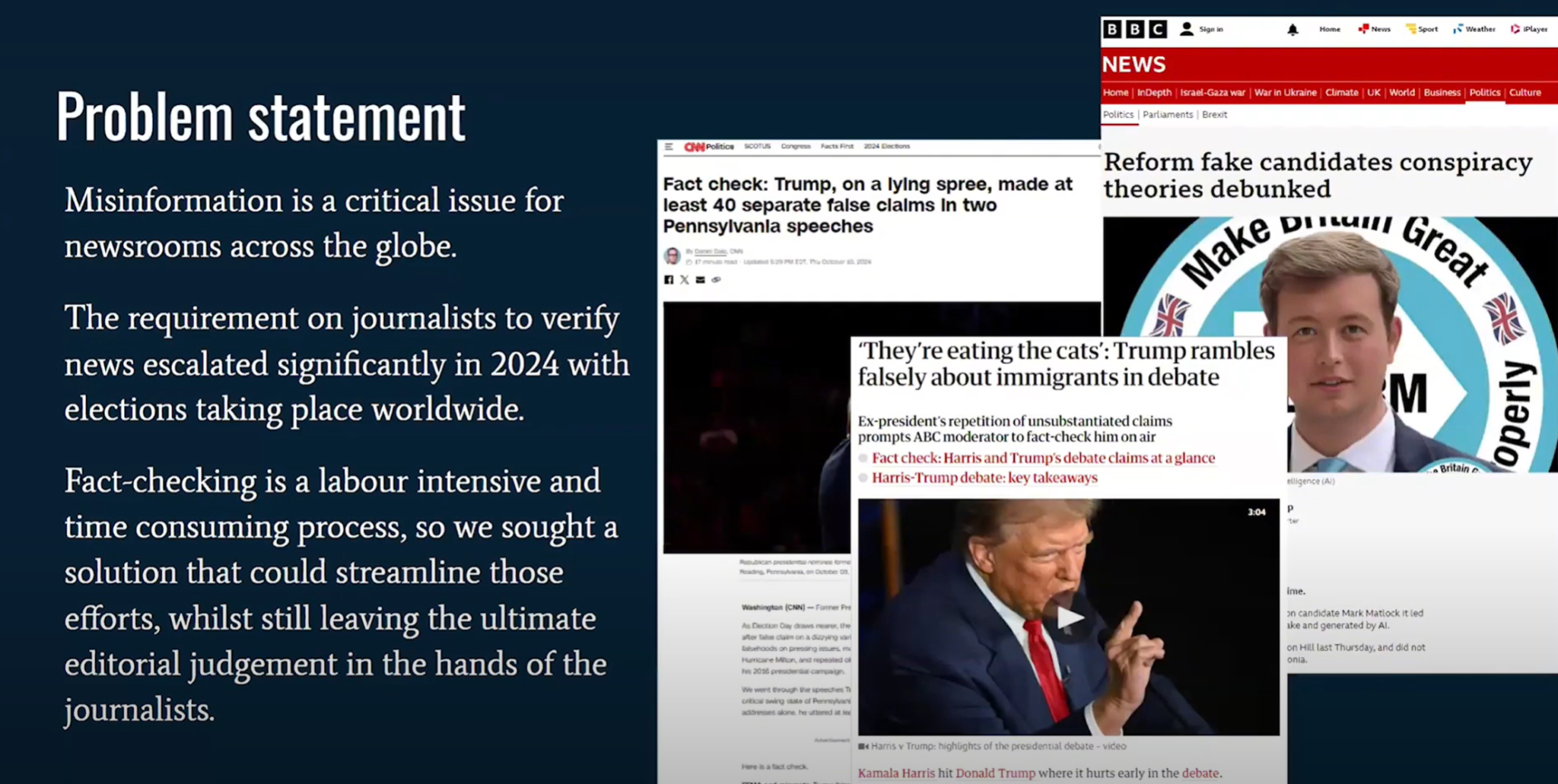 (0:31) Итак, как нас только что представили, мы — Checkmate, который является инструментом проверки фактов в реальном времени с помощью искусственного интеллекта. (0:39) Итак, мы начали с постановки проблемы: дезинформация является критической проблемой для новостных редакций по всему миру. (0:45) И эта проблема только обостряется, когда происходят значительные события, такие как политические выборы.