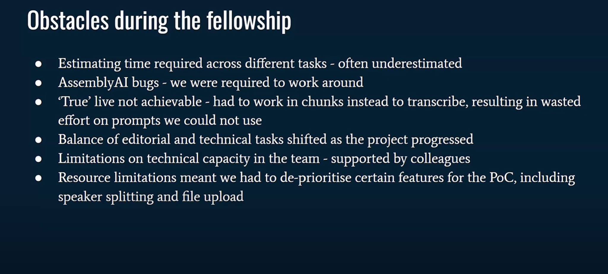(10:39) А ограничение ресурсов привело к тому, что нам пришлось отказаться от некоторых функций в доказательстве концепции. (10:45) Например, мы хотели разделить дикторов или даже обнаружить дикторов, чтобы инструмент сказал вам: (10:52) Хорошо, это сказал Дональд Трамп, но это, возможно, другой стипендиат. (10:59)