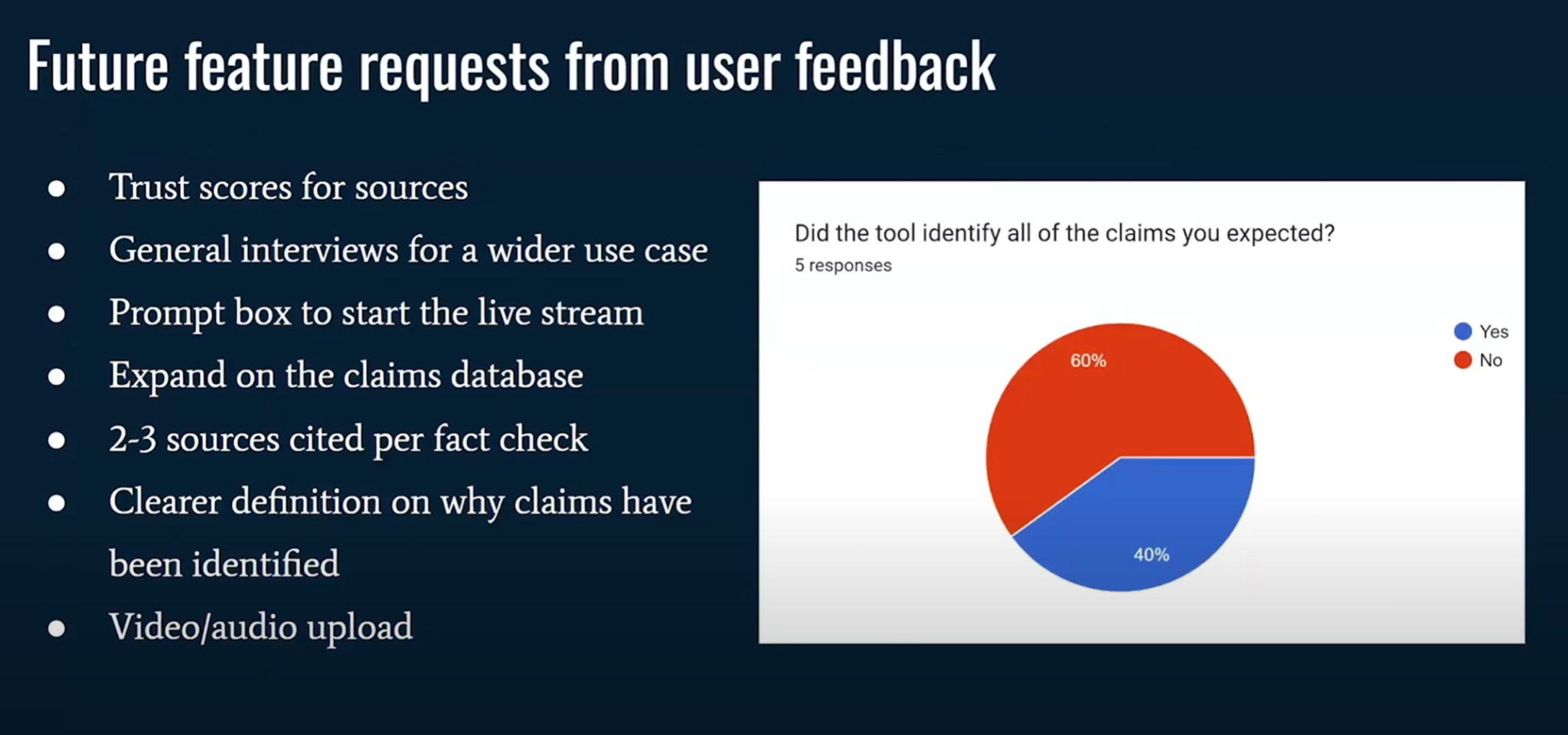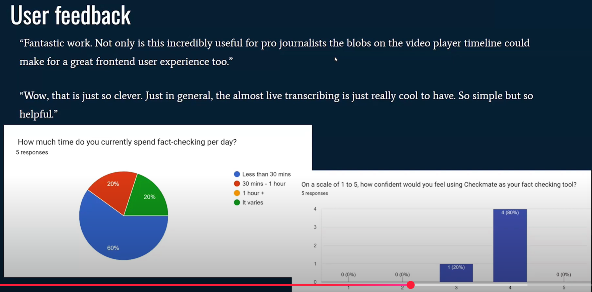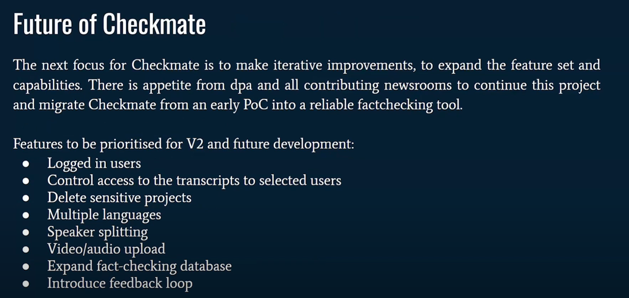 (11:11) Большинство из них заявили, что будут рады использовать такой инструмент, как Checkmate, в своей будущей работе. (11:18) Однако, поскольку они журналисты и любят задавать вопросы, они также прислали список пожеланий к будущим функциям. (11:26) Они подсказали нам, куда мы можем направить Checkmate в будущем.