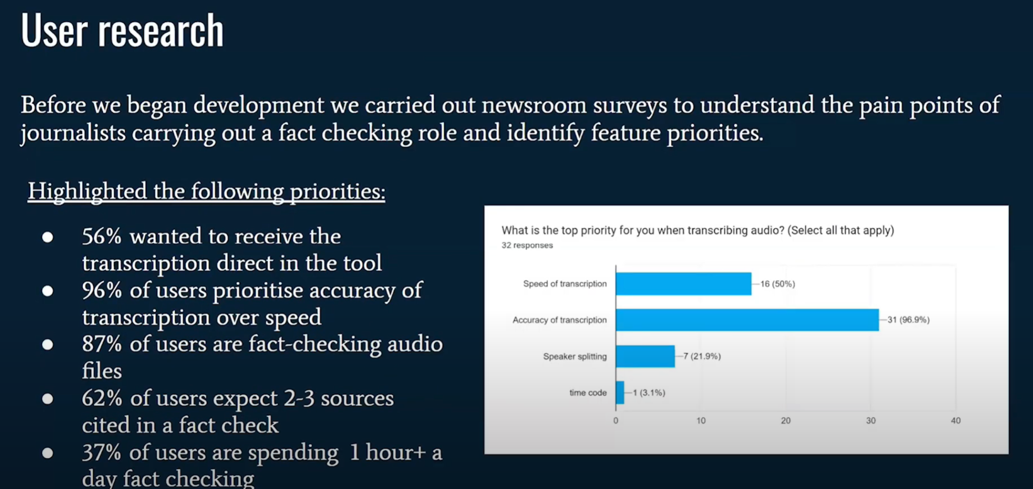 (1:03) Поэтому мы искали решение, которое могло бы упростить эти процессы и при этом оставить окончательное редакционное решение в руках журналистов. (1:14) Поэтому, прежде чем начать работу над Checkmate, мы провели несколько первоначальных исследований пользователей. (1:18) Мы сделали это потому, что хотели понять, какие ключевые болевые точки существуют у журналистов, а также какие ожидания они возлагают на подобный инструмент.