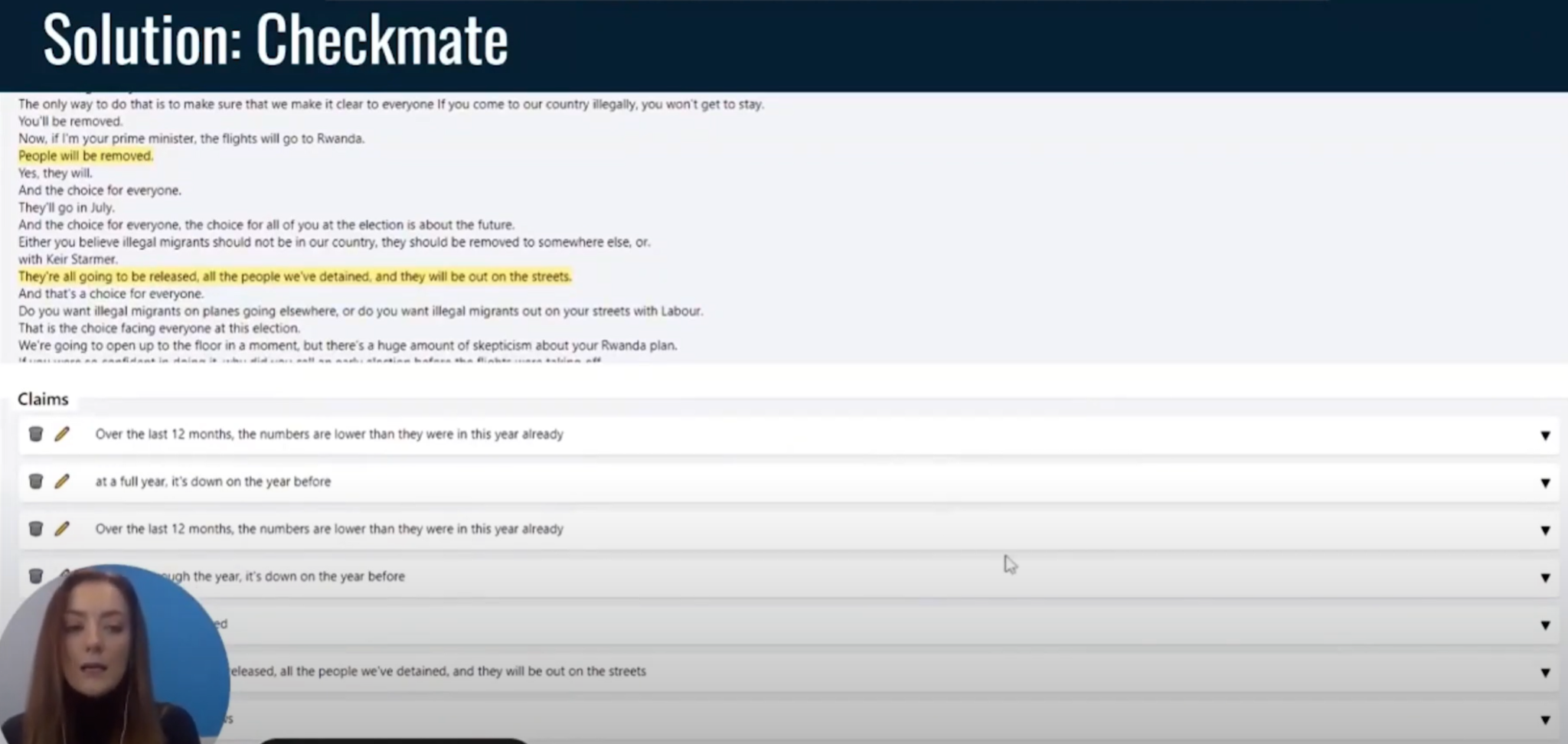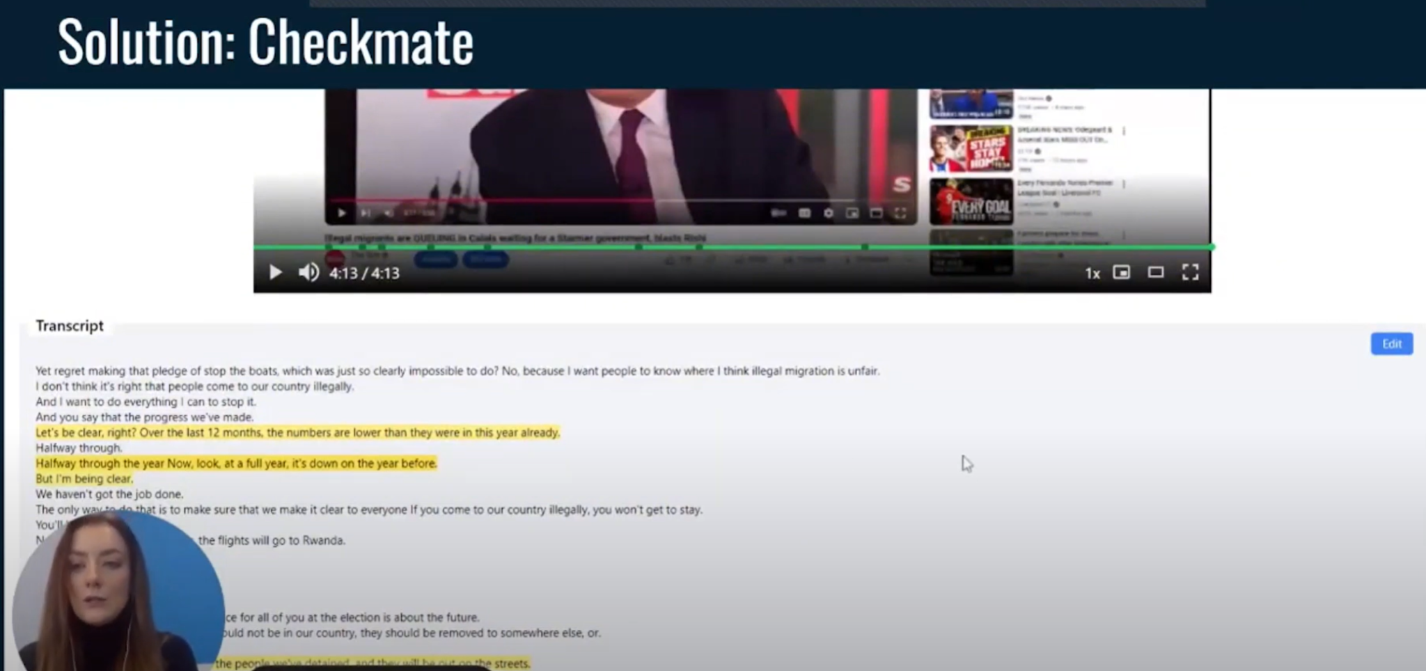 (4:56) Когда вы вернетесь к проигрывателю, и стенограмма будет завершена, и вы перестанете загружать ее в Checkmate, (5:03) вдоль полосы соскребания он также выделит претензии, которые программа обнаружила для вас. (5:10) И вы также можете увидеть небольшое резюме того, что это за претензия. (5:14) Это позволяет вам легко перейти к повторному просмотру определенного момента в видео.