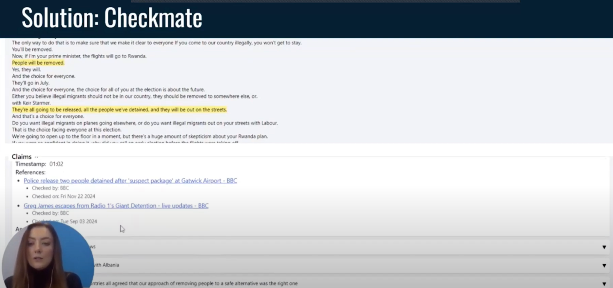 (0:10) Эта команда — Checkmate, это сотрудничество между DPA, которое является немецким агентством печати, (0:15) The Times и The Sun из News UK, Data Critica из Мексики и BBC. (0:20) Checkmate — это инструмент, который может выявлять претензии в режиме реального времени в прямых трансляциях. (0:25) И сегодня, чтобы рассказать нам больше о проекте, у нас есть Надин и Арне, и я передаю их вам.