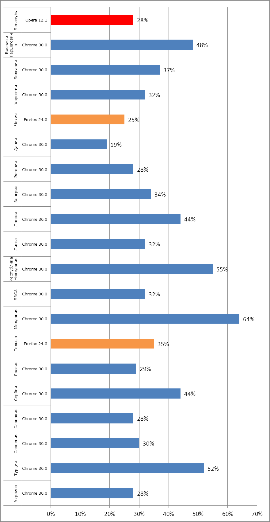 64 процента всего веб-трафика в этой стране сгенерировано с помощью данного веб-браузера. Польша и Чешская Республика – исключения, в которых 35 и 25 процентов пользователей, соответственно, пользуются браузером Firefox 24.0. Что касается Беларуси, то там наиболее популярен браузер Opera 12.1 – 28 процентов просмотренных страниц было сделано с использованием этого браузера.