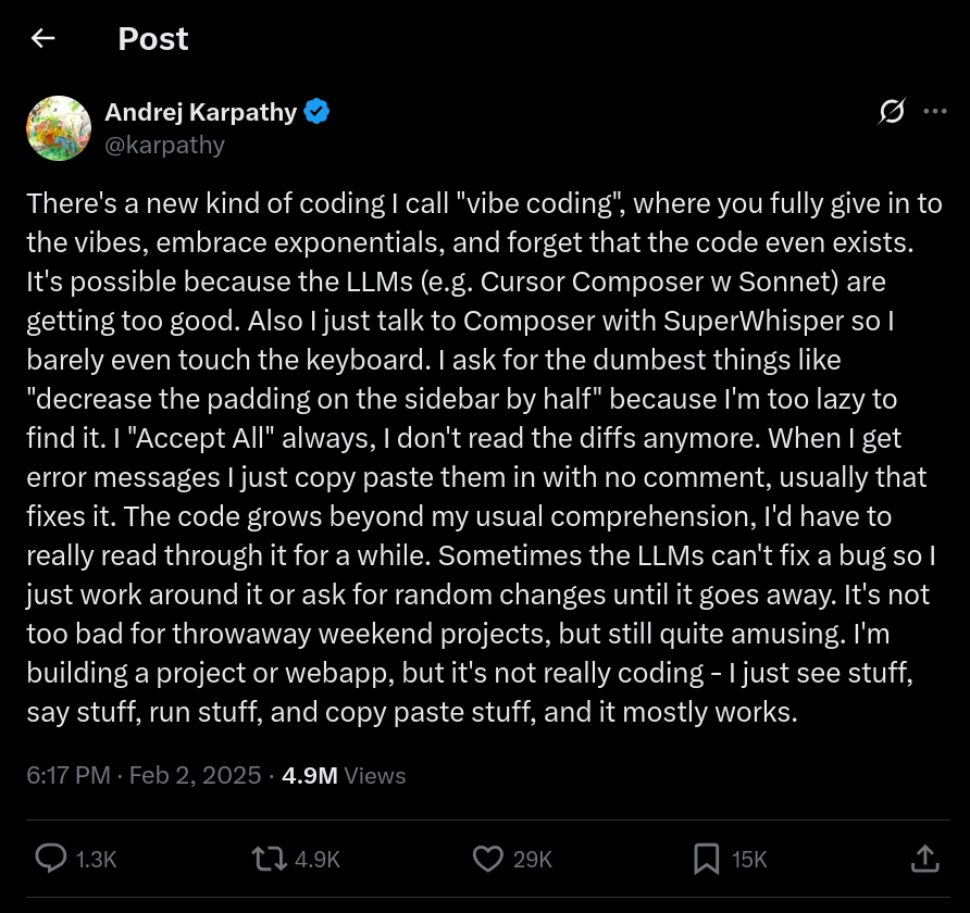 «Есть новый вид кодирования, который я называю «виброкодированием», когда вы полностью отдаетесь вибрациям, принимаете экспоненты и забываете, что код вообще существует». — Карпати, февраль 2025 г.
