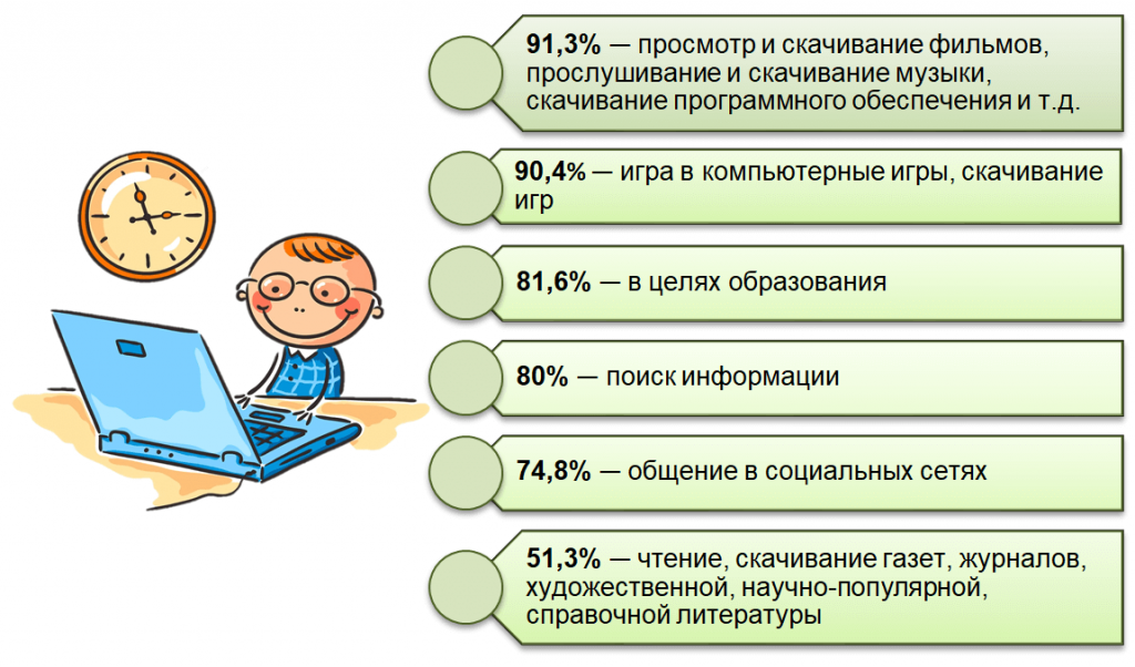 (по данным выборочного обследования домашних хозяйств по уровню жизни; в процентах от общего числа интернет-пользователей в возрасте 6 — 17 лет)