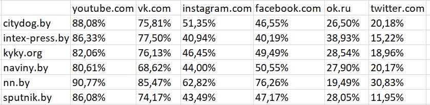 Проведенные исследования дают уникальную возможность узнать кросс-посещение социальных медиа интернет-пользователями в Беларуси:
