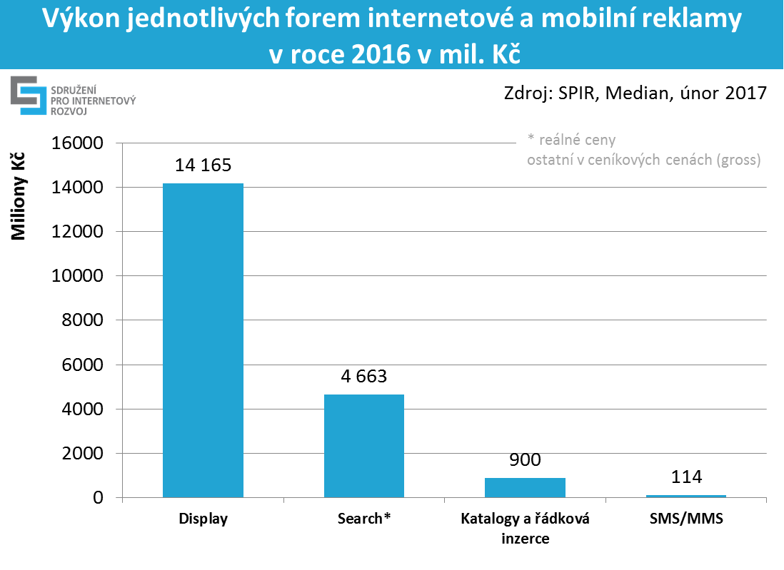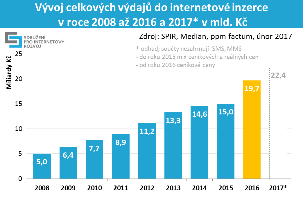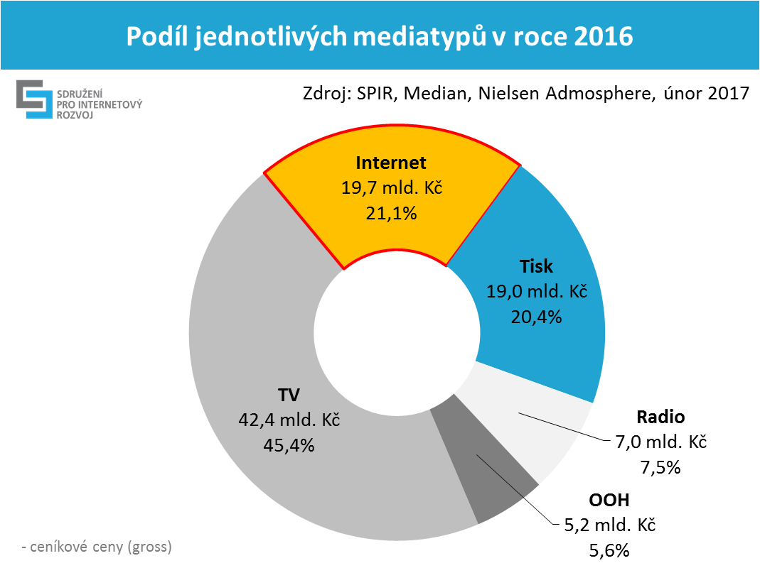 Интернет-реклама в Чехии достигла рекордного значения в 2016 году – почти 20 миллиардов чешских крон или 729 миллионов евро. Общая доля интернет-рекламы достигла 21,1%. Весь рекламный рынок Чехии – 3,43 миллиарда EUR. Население 10,5 миллиона. ВВП Чешской республики был на уровне 180 миллиародов евро, что означает доля рекламного рынка составляет 1,9%.