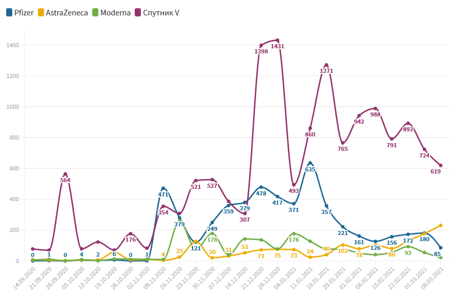 Сегодня (13 марта 2021), видно как возросло число упоминаний компании AstraZeneca. Это связано с новостью, что молодая учительница средней школы умерла в Словакии после прививки от коронавируса вакциной производства британско-шведской компании AstraZeneca. Данную новость со ссылкой на российской информационное агентство ТАСС начали распространять беларуские медиа с государственной формой собственности, как БелТА и СБ. Затем новость начали распространять различные беларуские новостные агрегаторы. Можно ожидать и репостов в региональной прессе.