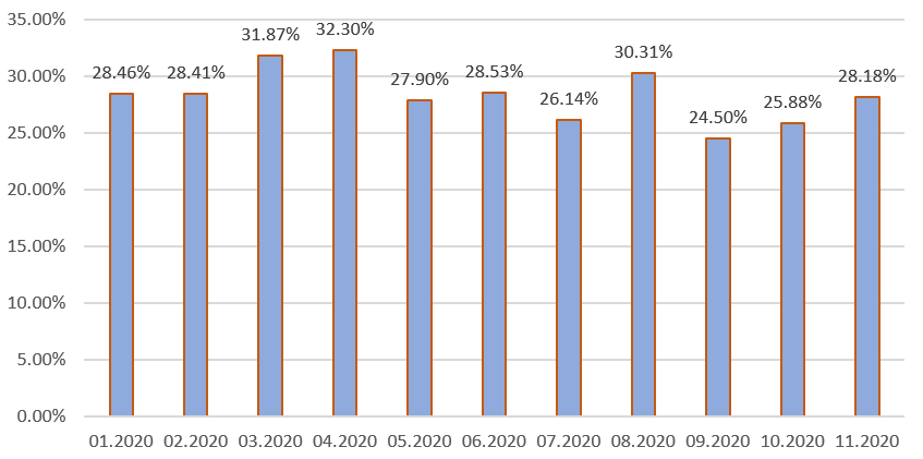 Как видно из графика, что максимальные охваты были в марте-апреле, первая волна коронавирусной пандемии COVID-19, наши прошлые публикации еженедельных охватов показывали, что в начале апреля был абсолютный максимум, когда были зафиксированы первые летальные исходы, связанные с коронавирусом. Тридцатипроцентная отметка охвата была преодолена в августе 2020, когда была финальная часть летней президентской кампании.