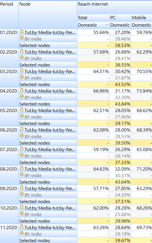 Проанализируем с помощью ежемесячных данных регулярного медиаисследования gemiusAudience общий охват (Reach, %) беларуских независимых медиа с учетом пересещения аудиторий, что означает возможность посещения пользователями нескольких информационных источников в течение месяца. Было агрегировано более 40 беларуских онлайн-медиа, включая региональную прессу. Не были включены новостные разделы крупнейших беларуских порталов. Анализируется только беларуская компьютерная аудитория в возрасте 15-74 года, которая составляет 4,27 миллиона человек.