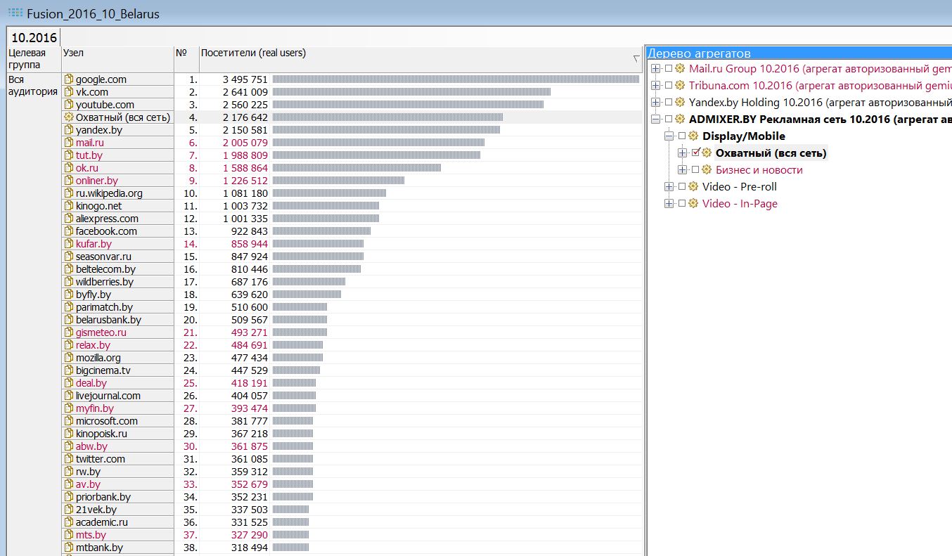 Уникальная характеристика аудиторного исследования gemiusAudience – это возможность агрегировать группы сайтов, разделов сайтов по различным признакам – медиа-собственник, сэйлз-хауз, тематические категории с учетом пересечения аудиторий. Аудиторию агрегированных сайтов можно изучать, так же как одиночных вебсайтов и разделов, по социально-демографическим и поведенческим характеристикам. Многие годы существования исследования на рынке в Беларуси это была сильно недооценённая возможность белорусскими агрегатами. Ее использовали только крупнейшие российские игроки, такие как Mail.ru Group и Yandex.