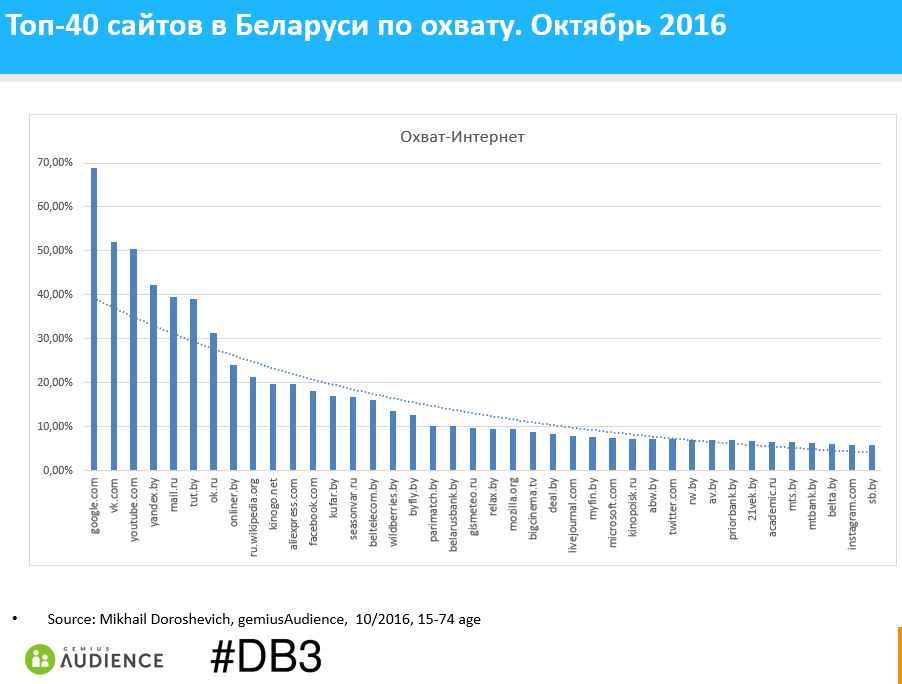 Теперь вернемся к аудитории беларуского интернета. Если взять из результатов медиаисследования gemiusAudience, за октябрь 2016, опубликованных исследовательской компанией #DB3, первых 40 веб-сайтов по охвату: