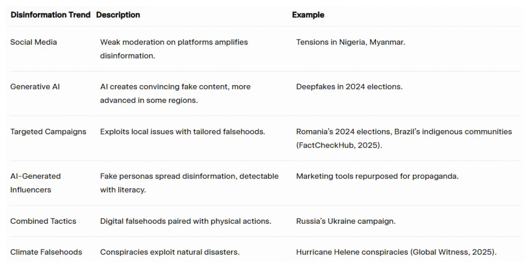 Дезинформация в 2025 году — сложная проблема, обусловленная технологиями и глобальной напряжённостью. Хотя она широко распространена во многих регионах, её сложность варьируется в зависимости от локального доступа к технологиям. Ключевые тенденции включают: