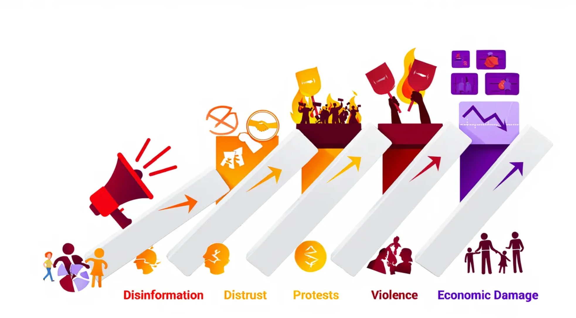 Дезинформация может быстро повлиять на общественное мнение, как это было на выборах в США в 2024 году, когда ложные заявления о фальсификации результатов голосования широко распространились. Она также может разжечь беспорядки, как во время беспорядков в Саутпорте в Великобритании, или помешать ликвидации последствий стихийных бедствий, распространяя теории заговоров, связанных с изменением климата. Со временем она рискует подорвать доверие к институтам власти и расколоть сообщества, что затруднит взаимодействие обществ.