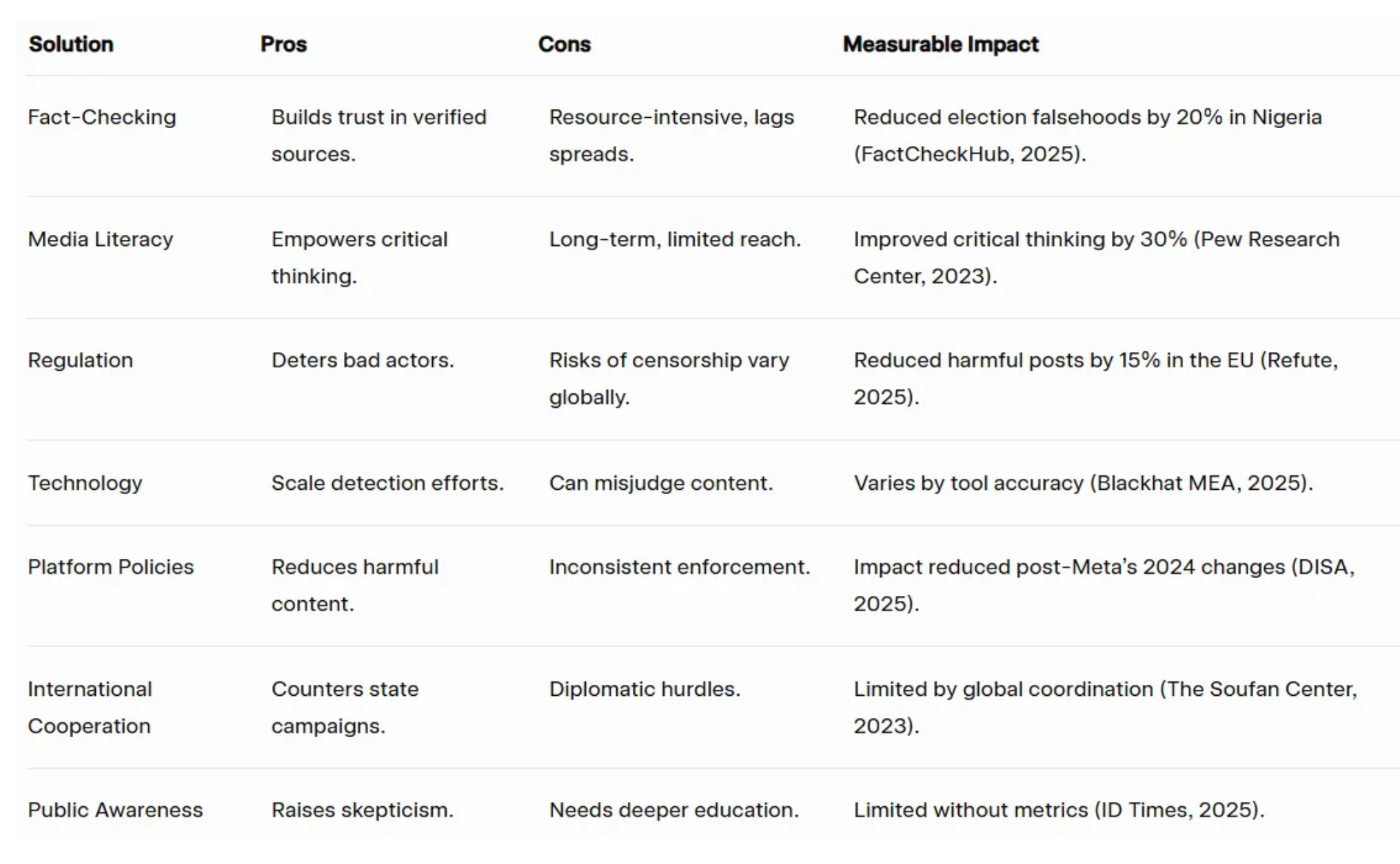 Идеальное решение объединило бы все стратегии: надёжную проверку фактов, всеобщую медиаграмотность, прозрачное регулирование с контролем, этичные инструменты искусственного интеллекта, последовательную политику платформы, глобальные соглашения и постоянные кампании по повышению осведомленности. Это позволило бы создать устойчивую информационную экосистему, но она сталкивается с такими проблемами, как политическое сопротивление и ограниченность ресурсов.