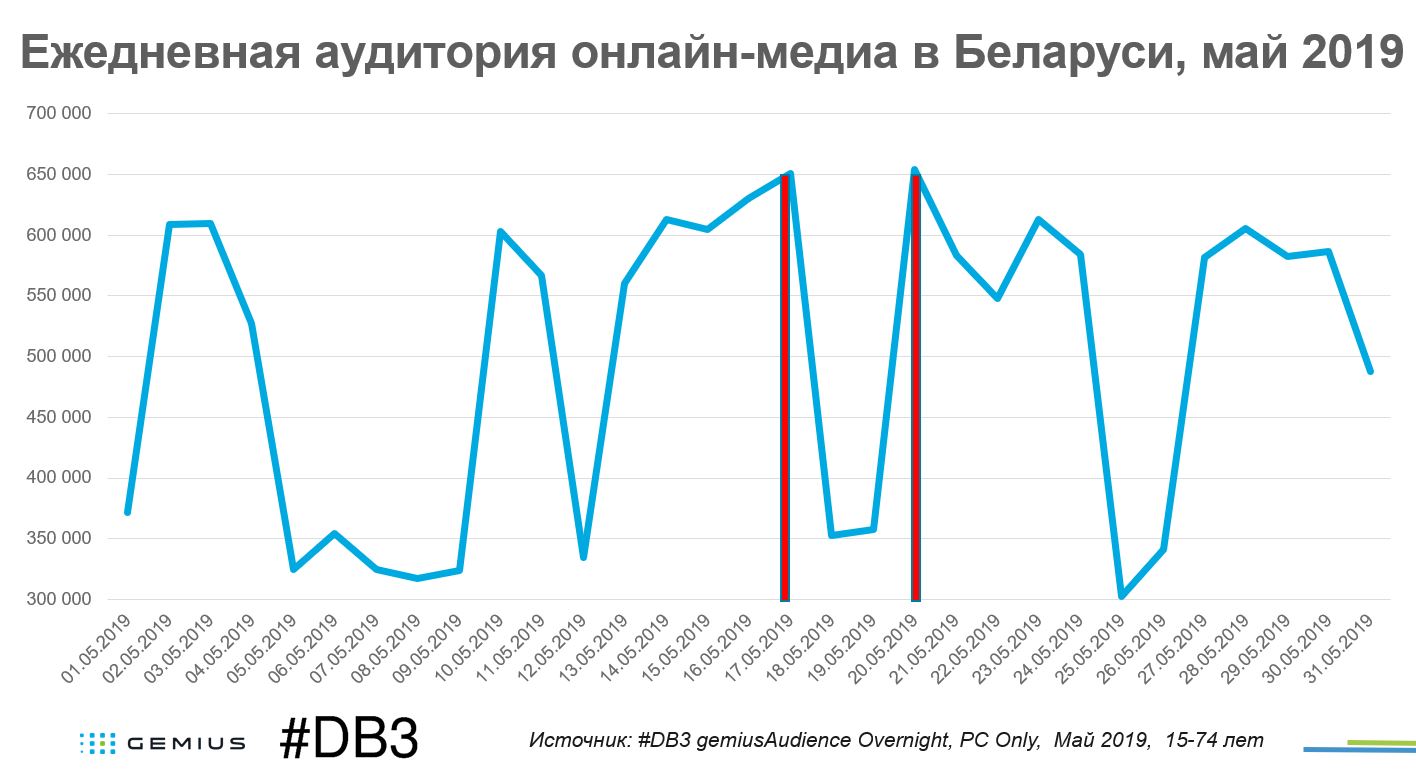 Как менялась ежедневная беларуская компьютерная интернет-аудитория онлайн-медиа в мае 2019, по данным медиаисследования gemiusAudience, проводимого по инициативе исследовательской компании #DB3/