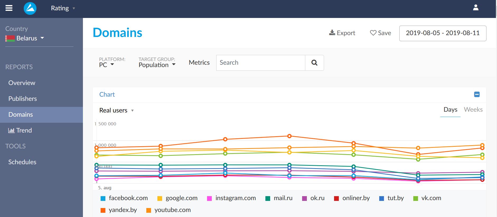 Топ12 сайтов, включая и неаудируемые, по числу беларуских компьютерных посетителей 5-11 августа 2019 года: