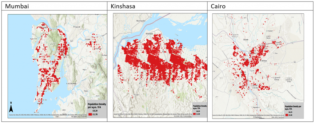 Рассмотрим следующие три города, в которых мы применяем методику горячих точек: Мумбаи, Киншаса и большой Каир (Рис.2). Красные зоны соответствуют потенциальным горячим точкам: областям, где концентрация населения превышает максимальный порог для поддержания социальной дистанции. В Мумбаи они охватывают 104,5 км 2 это составляет примерно 4,5 миллиона человек. В городе с предполагаемым общим населением 20 миллионов человек, мы находим, что около 20% населения не сможет поддерживать социальную дистанцию и подвергаться риску быстрого заражения, только потому, что построенная окружающая среда не позволяет этого. В Киншасе горячие точки охватывают примерно 138 км2 подвергая риску около 5,88 миллиона человек-около 53% от общей численности населения. В Каире горячие точки охватывают почти 84 км2 , на его долю приходится 5,5 млн человек или около 25% от общей численности населения.