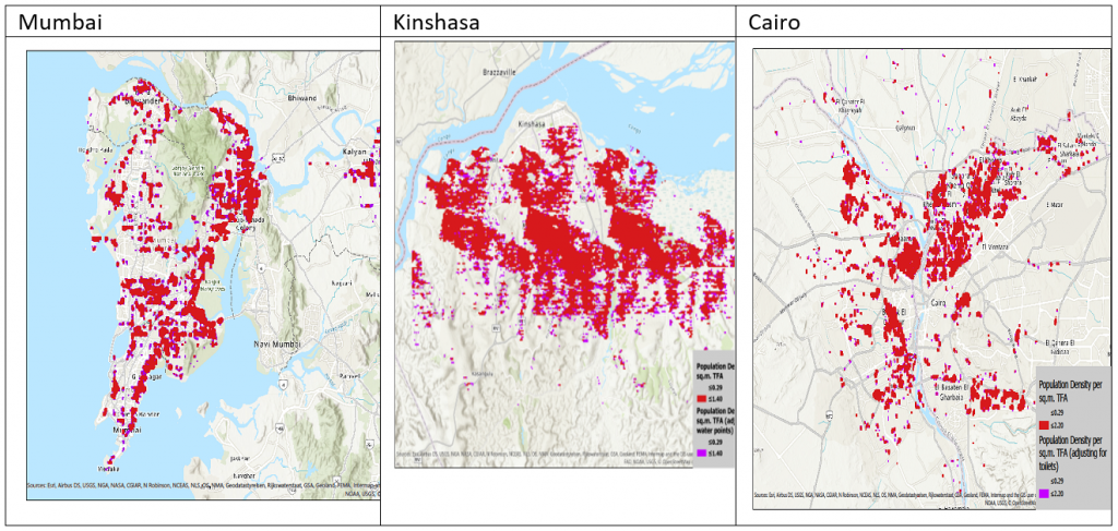 Мы определяем второй набор горячих точек, включающий расположение ключевых служб и мобильность по отношению к ним (Рисунок 3, фиолетовым цветом). Для Мумбаи мы используем расположение общественных туалетов в качестве ключевого сервиса, который люди все еще будут использовать даже под блокировкой. Мы находим, что дополнительные горячие точки охватывают дополнительные 15 км2 часто рядом с предыдущим набором горячих точек, а также с несколькими новыми областями, затронутыми также. На эти дополнительные горячие точки приходится более 600 000 человек, в результате чего общая численность пострадавшего населения составляет 5,2 миллиона человек (увеличение на 15% в группе риска). В Киншасе, мы используем расположение киосков воды как ключевая услуга интереса. Мы находим, что дополнительные горячие точки охватывают дополнительные 32 км2 , что соответствует увеличению на 13 процентных пунктов числа людей из группы риска. Таким образом, общее число пострадавших составляет 6,6 миллиона человек, или две трети населения Киншасы. В Каире мы используем расположение общественных туалетов, чтобы найти дополнительные горячие точки. Эти добавляют 15 км 2 (в общей сложности почти 100 км2), а общее число пострадавших людей увеличивается примерно на 11 процентных пунктов (до 36% от общей численности населения).