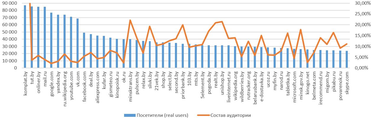 Гистограмма общая аудитория komplat.by и другими площадками. График доля аудитории komplat.by (в %) в аудитории другой площадки.