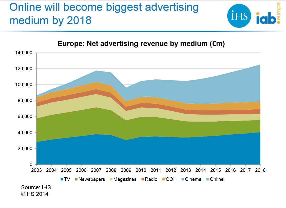 По прогнозам, расходы на интернет-рекламу выйдут на первое место, опередив телевидение, в Европе в 2018 году: