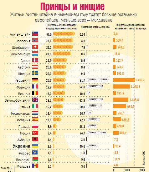 С другой стороны самыми богатыми признаны жители Лихтенштейна со среднедушевой покупательной способностью около 57 тыс. евро в год. На среднем уровне покупательской способности – Испания, где показатель на одного жителя составляет около 13 тыс. евро в год. В странах — членах ЕС наибольшей покупательной способностью обладают жители Люксембурга с показателем в 28 тыс. 924 евро.