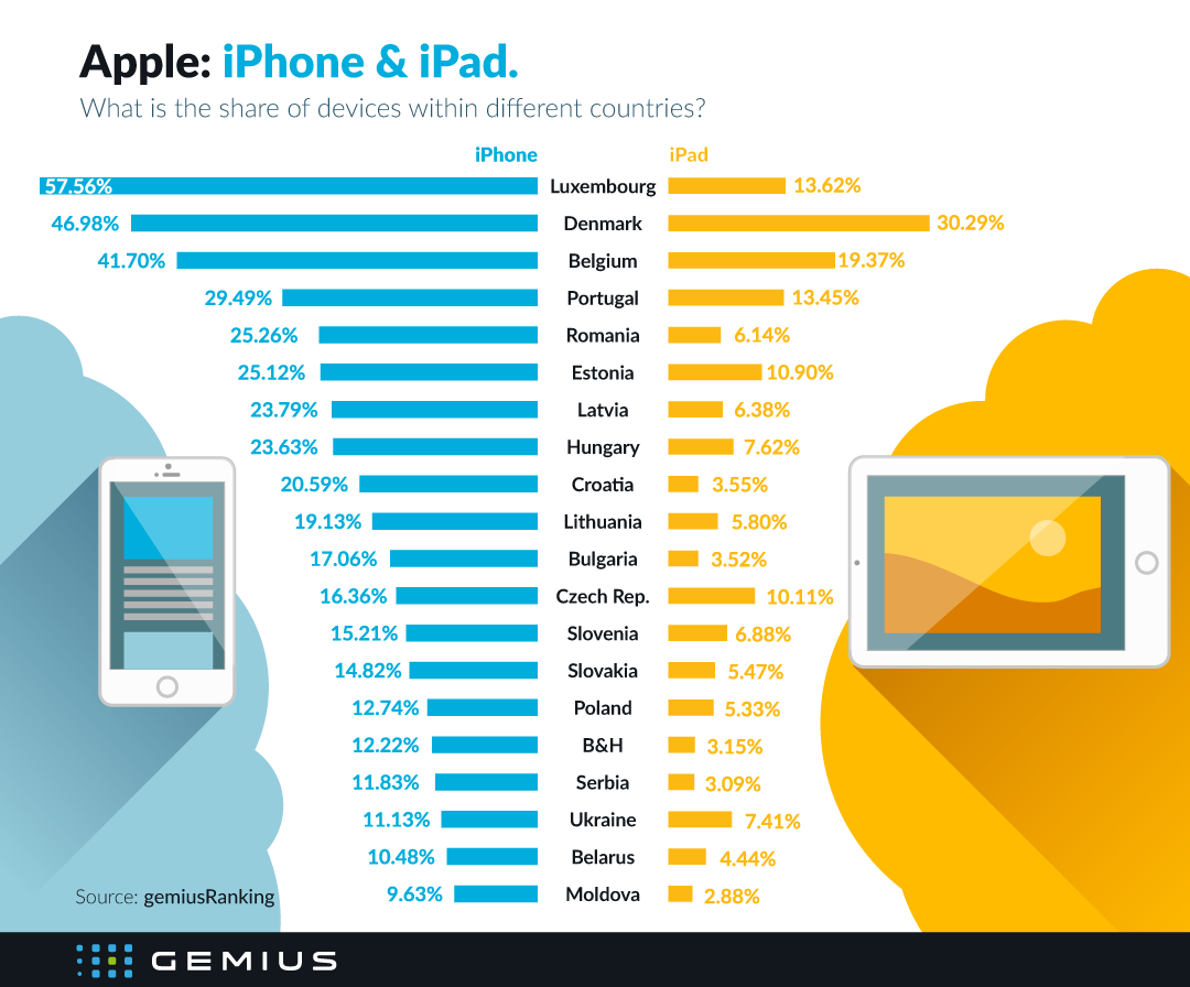Gemius подготовил график на основании данных gemiusPrism, в котором показана доля iPhone и iPad в различных европейских странах.