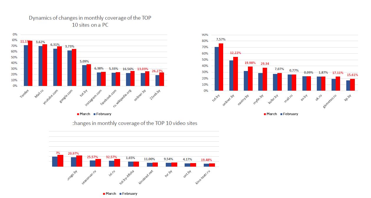 Графики дня: Рост аудитории крупнейших веб-сайтов в Беларуси, Март 2020