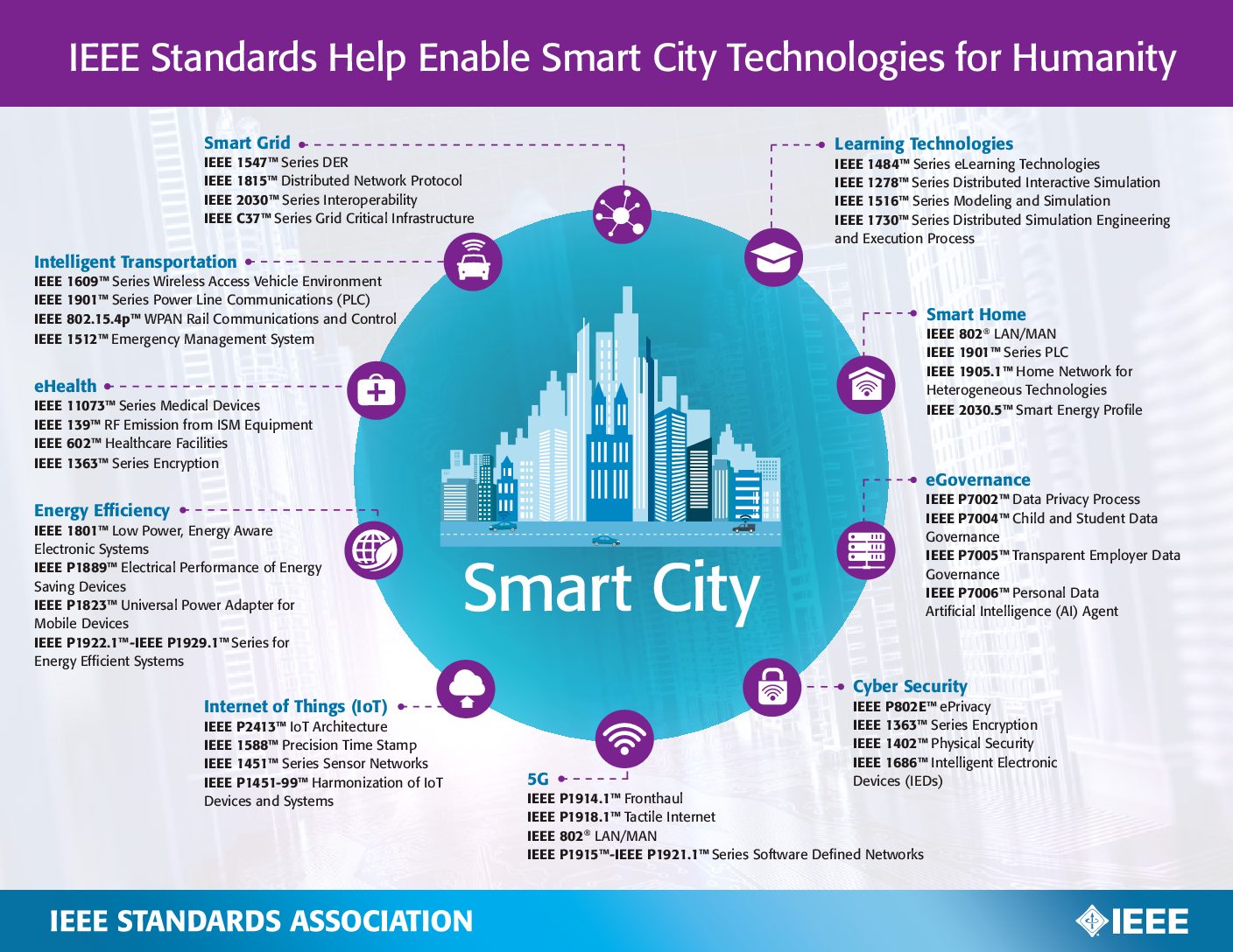 Институт инженеров электротехники и электроники — IEEE, международная некоммерческая ассоциация специалистов в области техники, мировой лидер в области разработки стандартов по радиоэлектронике, электротехнике и аппаратному обеспечению вычислительных систем и сетей, подготовила набор стандартов, которые могут использоваться при внедрении технологий для умных городов (Smart City):