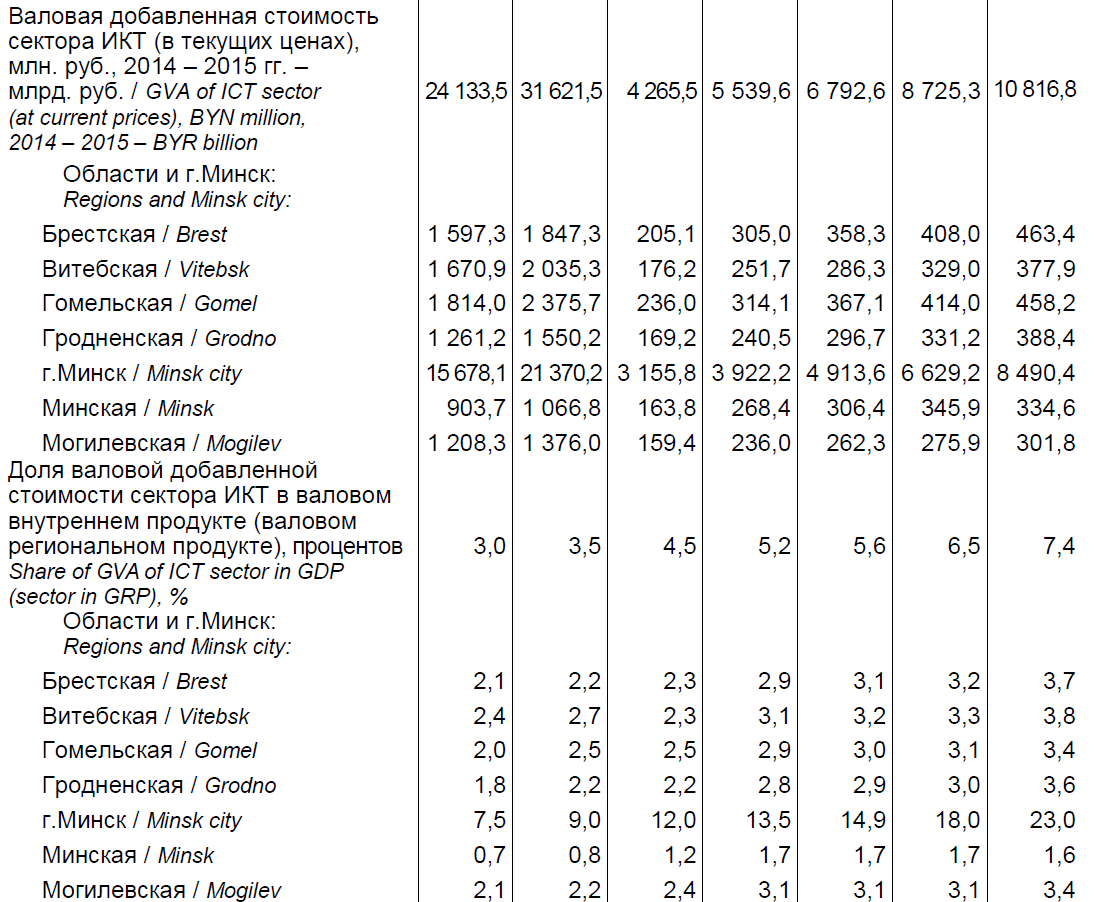 - Доля ИКТ в внутреннем валовом продукте (ВВП) составила 7,4% (10 816,8 миллионов BYN) в 2020 году против 3% в 2014 году;