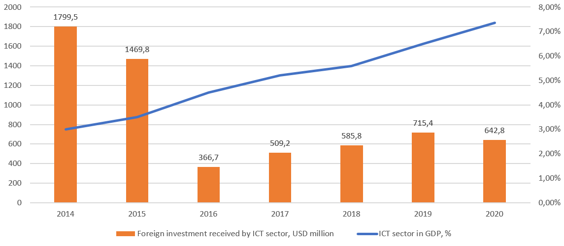- Экспорт ИКТ услуг составил 2 685,2 миллионов USD и товаров составил 404,9 миллионов USD в 2020 году;