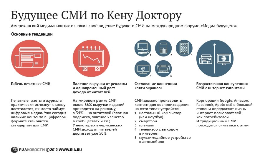 Традиционные печатные СМИ практически исчезнут к концу десятилетия, а их место займут цифровые медиа, которые вынуждены будут отказаться от доходов за счет рекламы и переключиться на читателей, заявил американский медиааналитик Кен Доктор на международном форуме “Медиа будущего”, проходящем в РИА Новости.