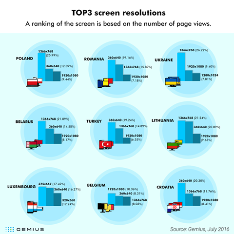Исследовательская компания Gemius, на основании данных исследования gemiusPrism, подготовил инфографику с наиболее популярными разрешением экранов в некоторых европейских странах: