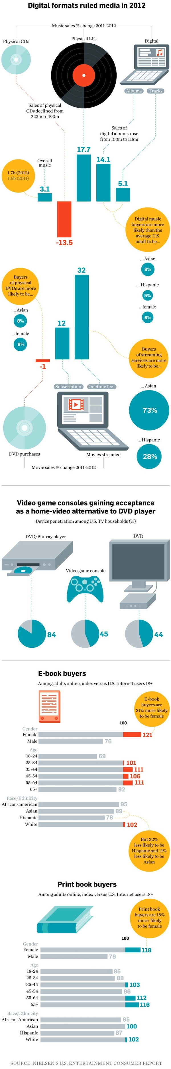 Home » Без рубрики Инфографика дня: Nielsen – Какие цифровые форматы доминировали на американском рынке в 2012 Author infopolicy Reading 1 min Views 549 Published by 08.06.2013 Любопытно, но падение продаж CD, даже в США абсолютно не удивляет. Большая картинка: Источник: http://www.marketingpilgrim.com/2013/06/infographic-nielsen-shows-digital-formats-dominate-how-consumers-get-media.html Похожее