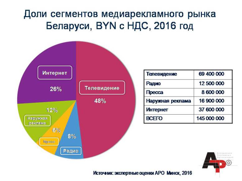 По данным АРО, в прошлом году суммарный объем сегментов ТВ, интернета, радио, прессы и наружной рекламы составил 145 млн белорусских рублей (72,5 миллиона евро)