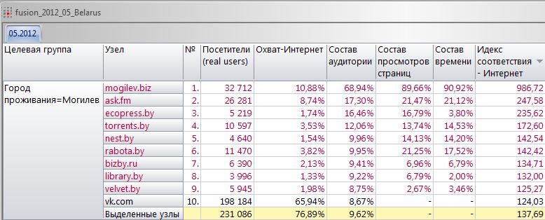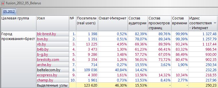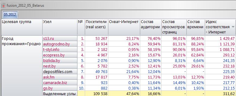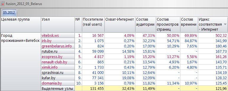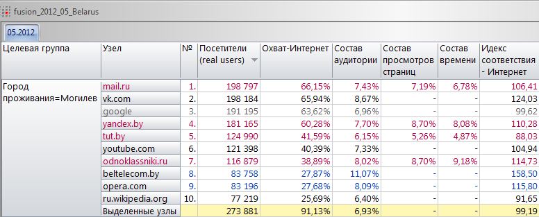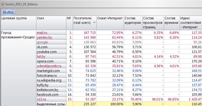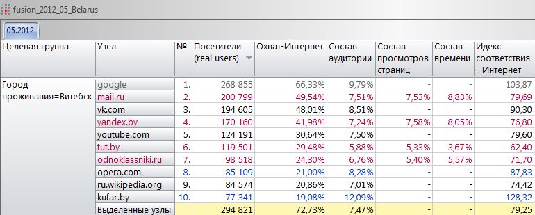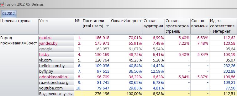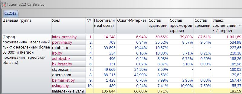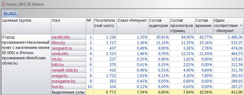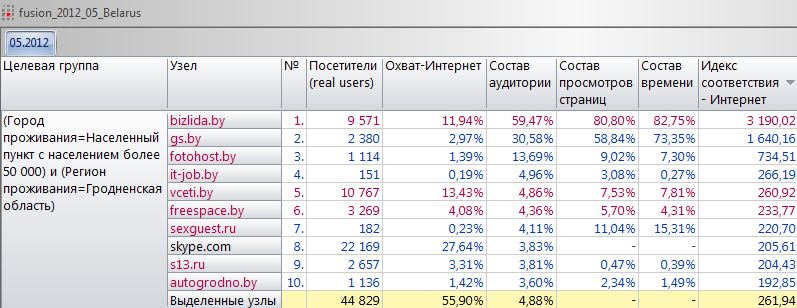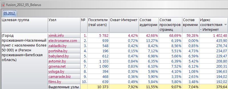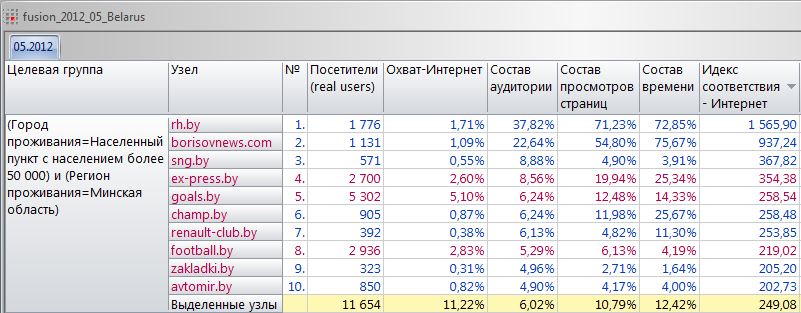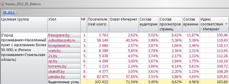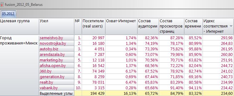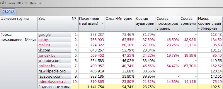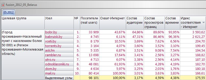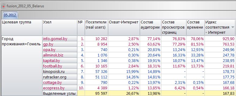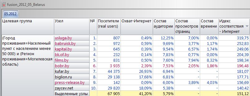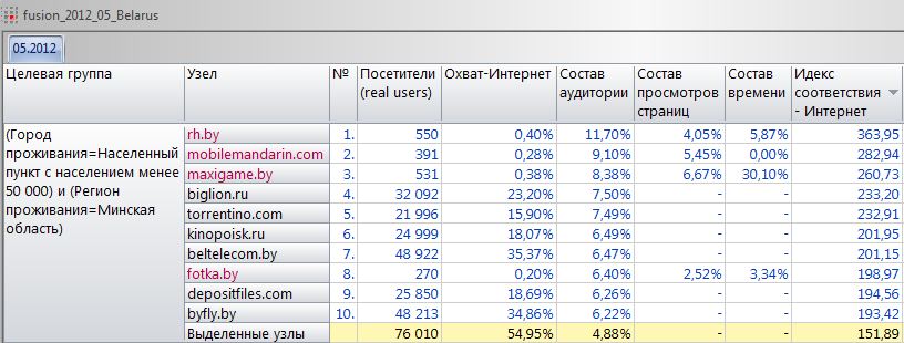 Как видно у трех ресурсов индекс соответствия (affinity) Минской аудитории оказывается ниже 100, т.е. это означает, что доля минской аудитории у этих ресурсов меньше, чем доля минской интернет-аудитории во всей интернет-аудитории.
