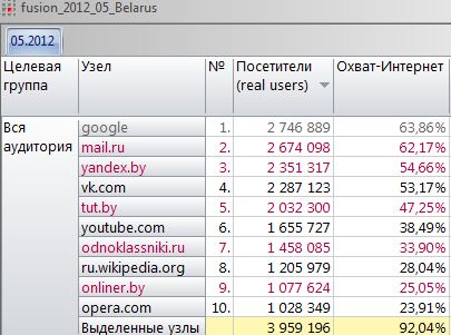 После первой публикации Интернет-аудитория: охват (Reach), индекс соответствия (Affinity), вовлеченность (Engagement) решил обратить внимание на белорусскую региональную интернет-аудиторию. Источник данных – Gemius, исследование gemiusAudience, 05/2012.
