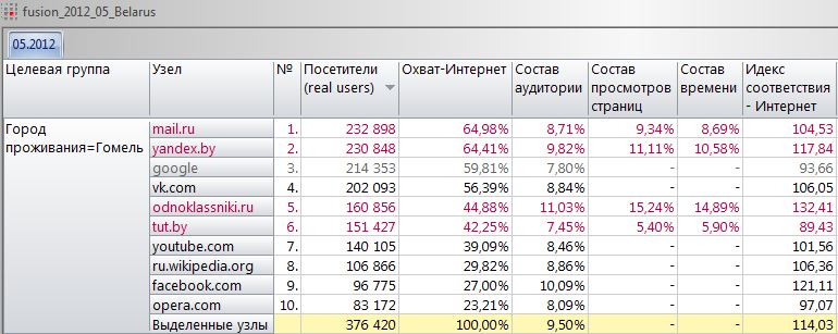 По причине малого числа региональных сайтов из гомельской области, участвующих в исследовании gemiusAudience, взяты только точные (не прогнозные данные):