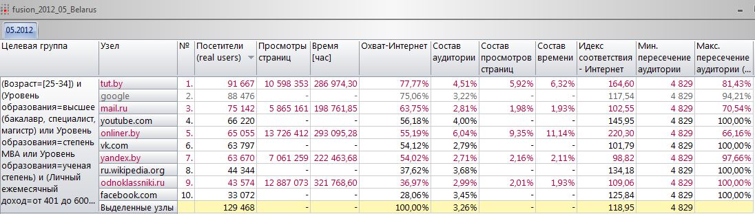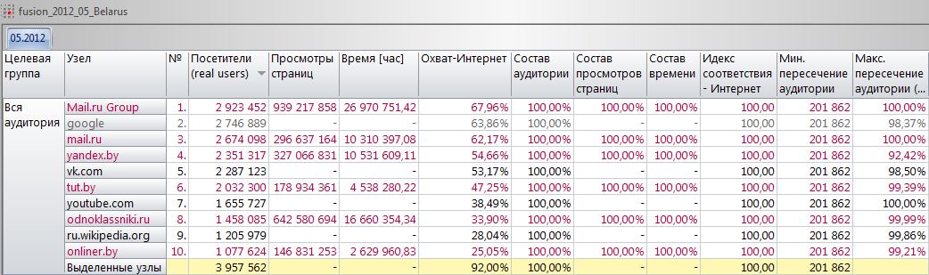 Из максимального пересечения аудиторий можно узнать про уникальность аудиторий. К примеру, у yandex.by – 7,58% (100%-92,42%), которые были только на Yandex.by из этих ресурсов. В отличии от аудитории Youtube.com (100%), где вся была аудитория была хотя бы на одном из других девяти ресурсов.