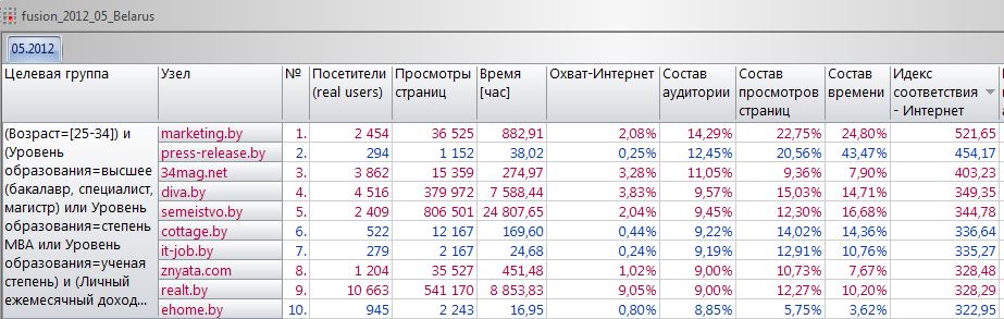 Сейчас ресурсы отсортированы по охвату. Прекрасно видно, что порядок изменился. Хочу обратить внимание на максимальное пересечение аудиторий. Здесь видно, что более трети аудитории данной ЦА на onliner.by (33,84%) не были на остальных ресурсах этой десятки.