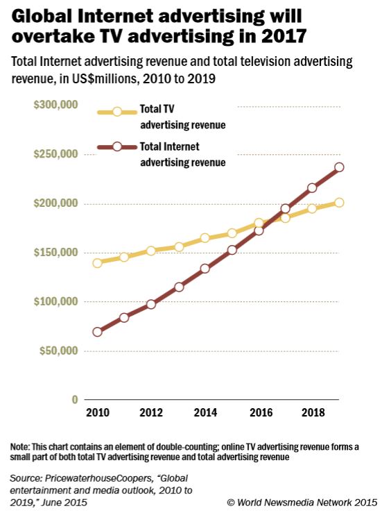 Как можно понять, что глобальное превышение интернет-рекламы над телевидением по деньгам произойдет из-за рекламного рынка США.