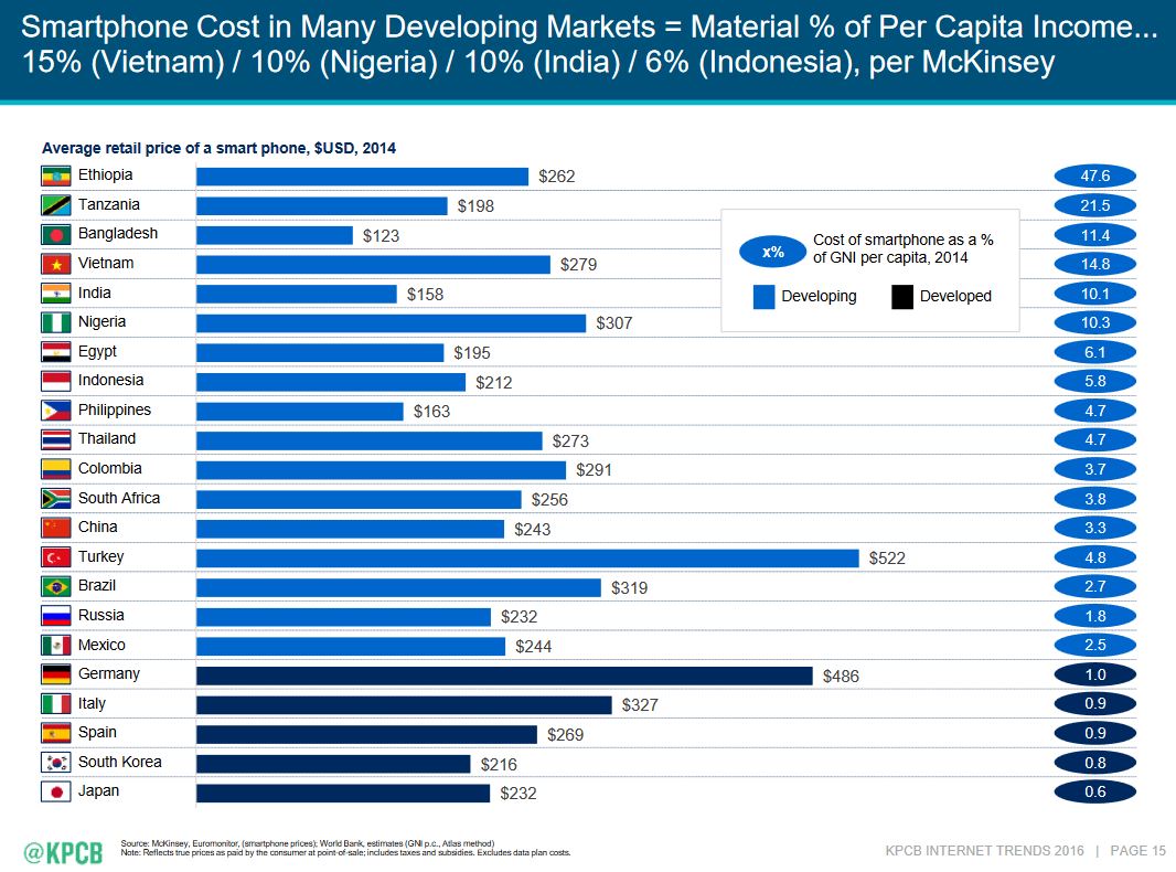 Как пример, слайд про среднюю цену смартфона в 2014 году и стоимость смартфона относительно GNI: