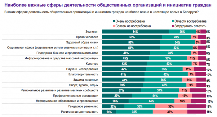 Так, например, выяснилось, что деятельность в области экологии респонденты считают наиболее важной. Примерно такой же процент опрошенных готов принимать участие в деятельности эко-организаций и инициатив.