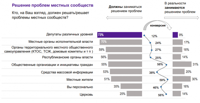 Удивительно и другое: 73% респондентов считают, что депутаты различных уровней должны заниматься решением проблем местных сообществ, но только 9% согласны с тем, что это происходит.